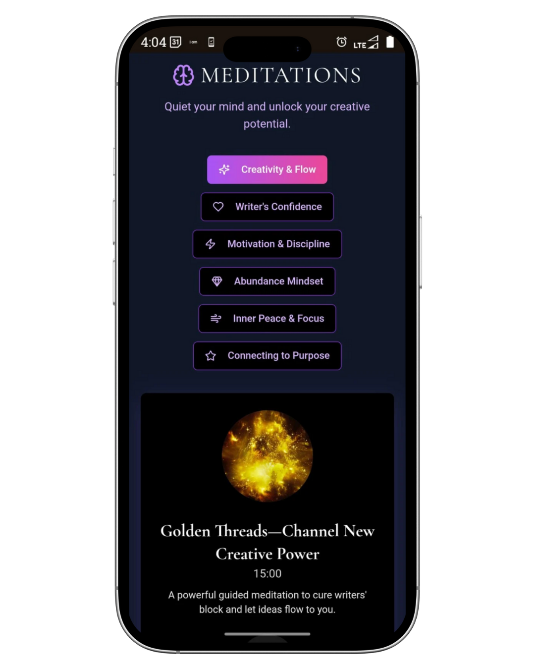“I just wanted to let you know how much I am enjoying the Write Catalyst App. I love my evening ritual. I intend to make it a regular part of my evening routine. The music is spot on for concentration and meditation.